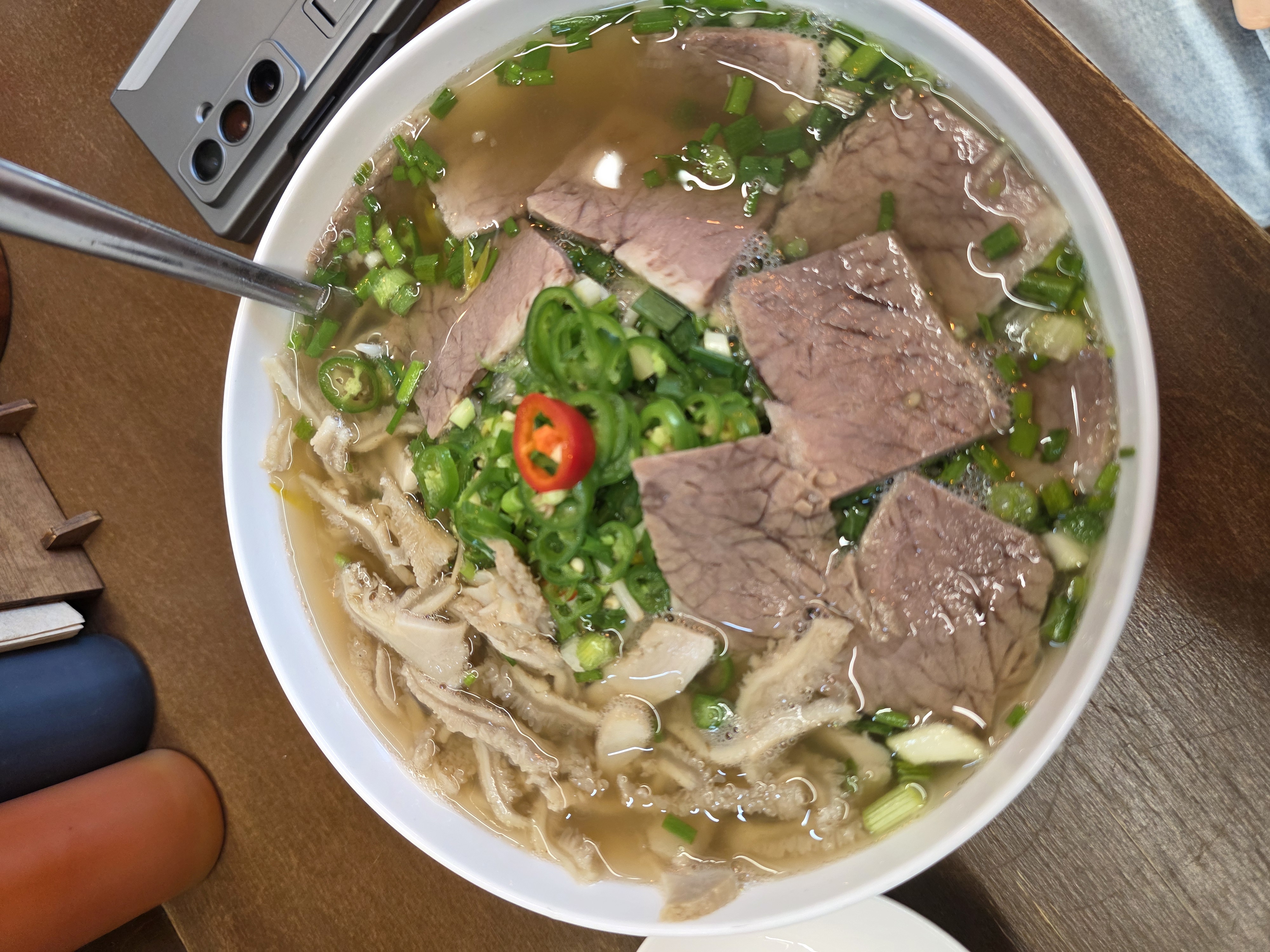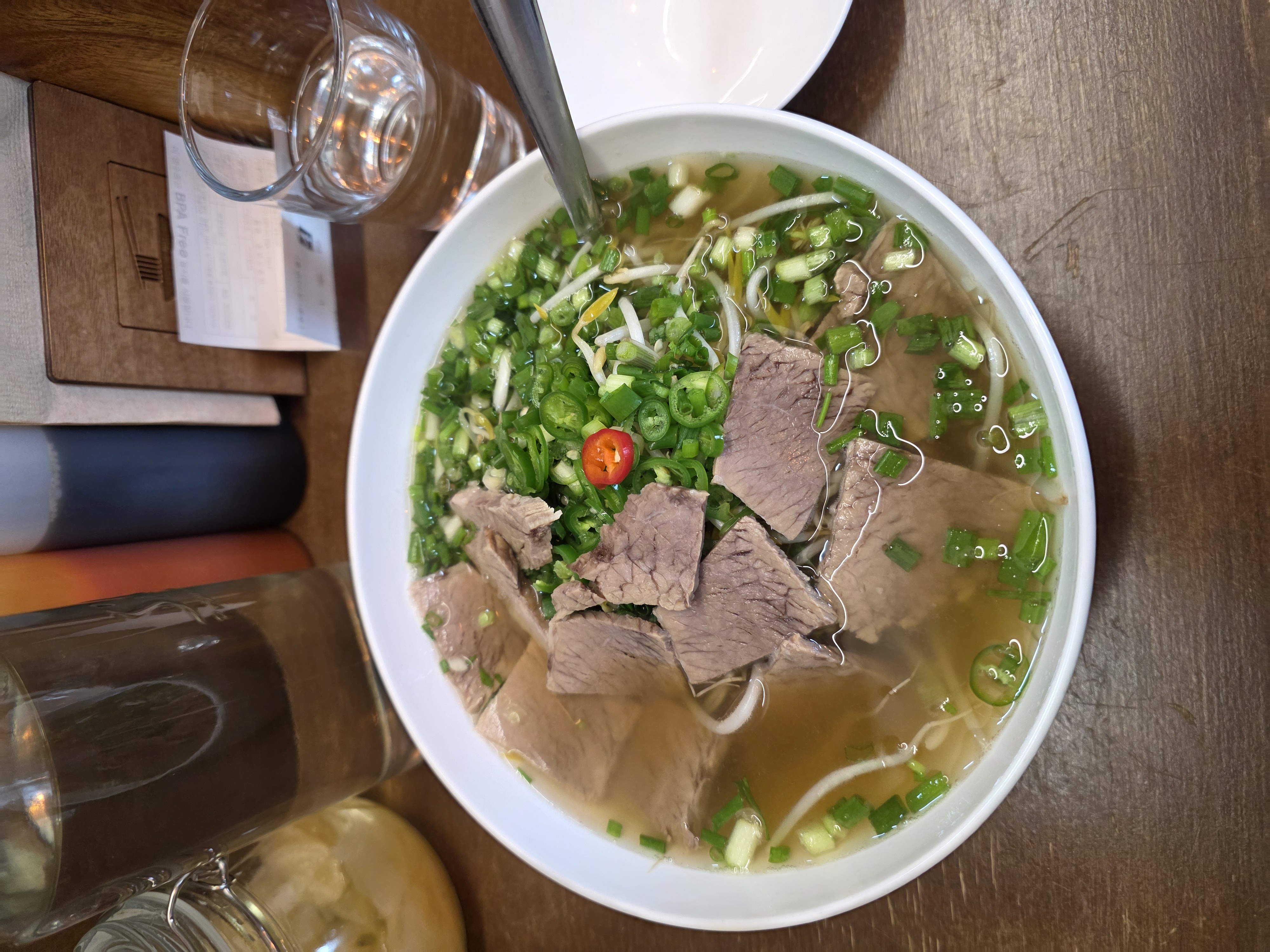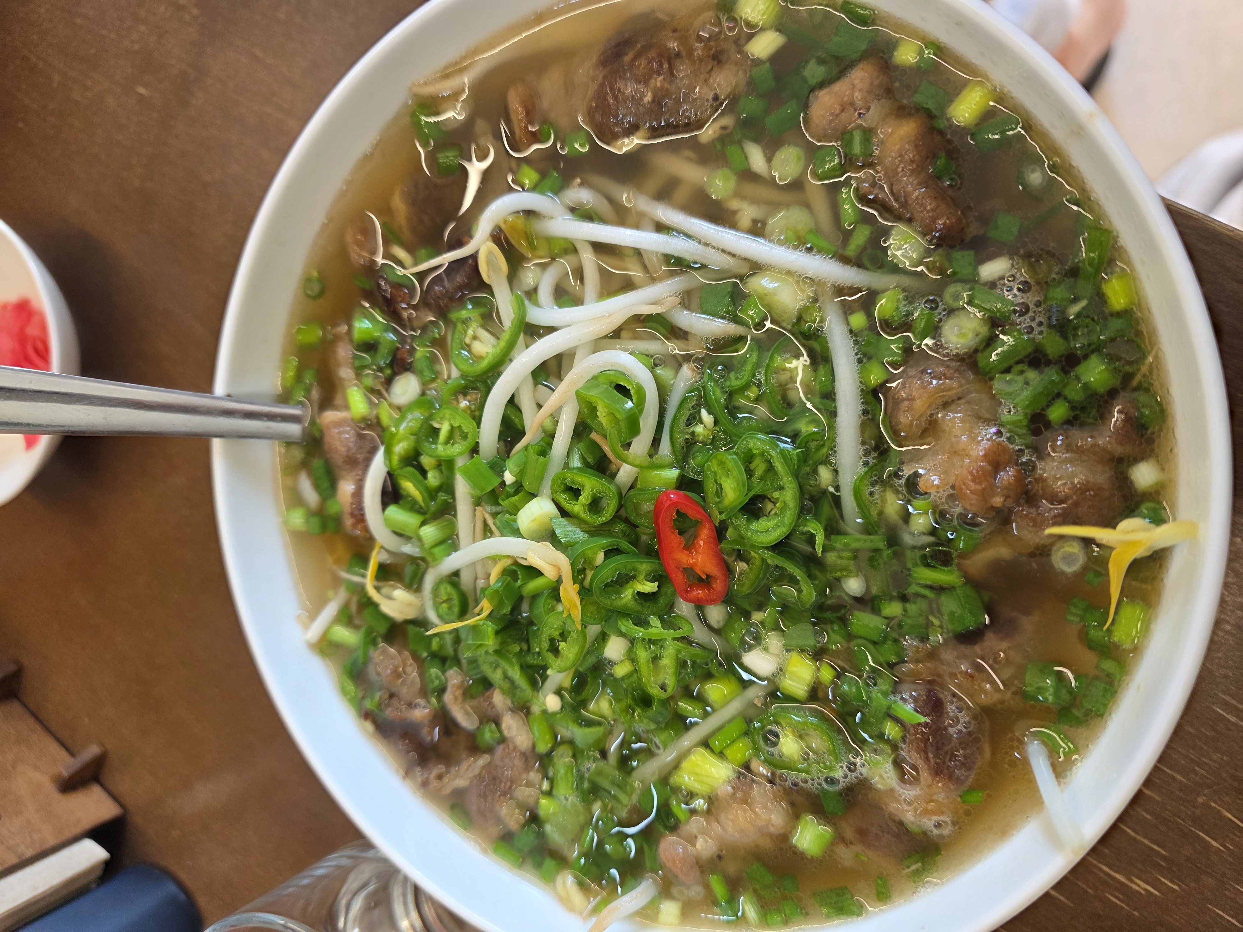 ✨비주얼 합격! : 한 그릇 가득 담긴 쌀국수 위로 신선한 숙주, 쪽파, 그리고 땡초가 수북하게 올라가 있습니다. 푸짐한 양에 보기만 해도 속이 든든해지는 기분입니다. 취향에 따라 고수추가 요청해도 되고 면 추가도 1회 가능하다고 하니 거의 남자분들은 면추가 해서 드시더라구요. 저는 한그릇도 충분했어요.