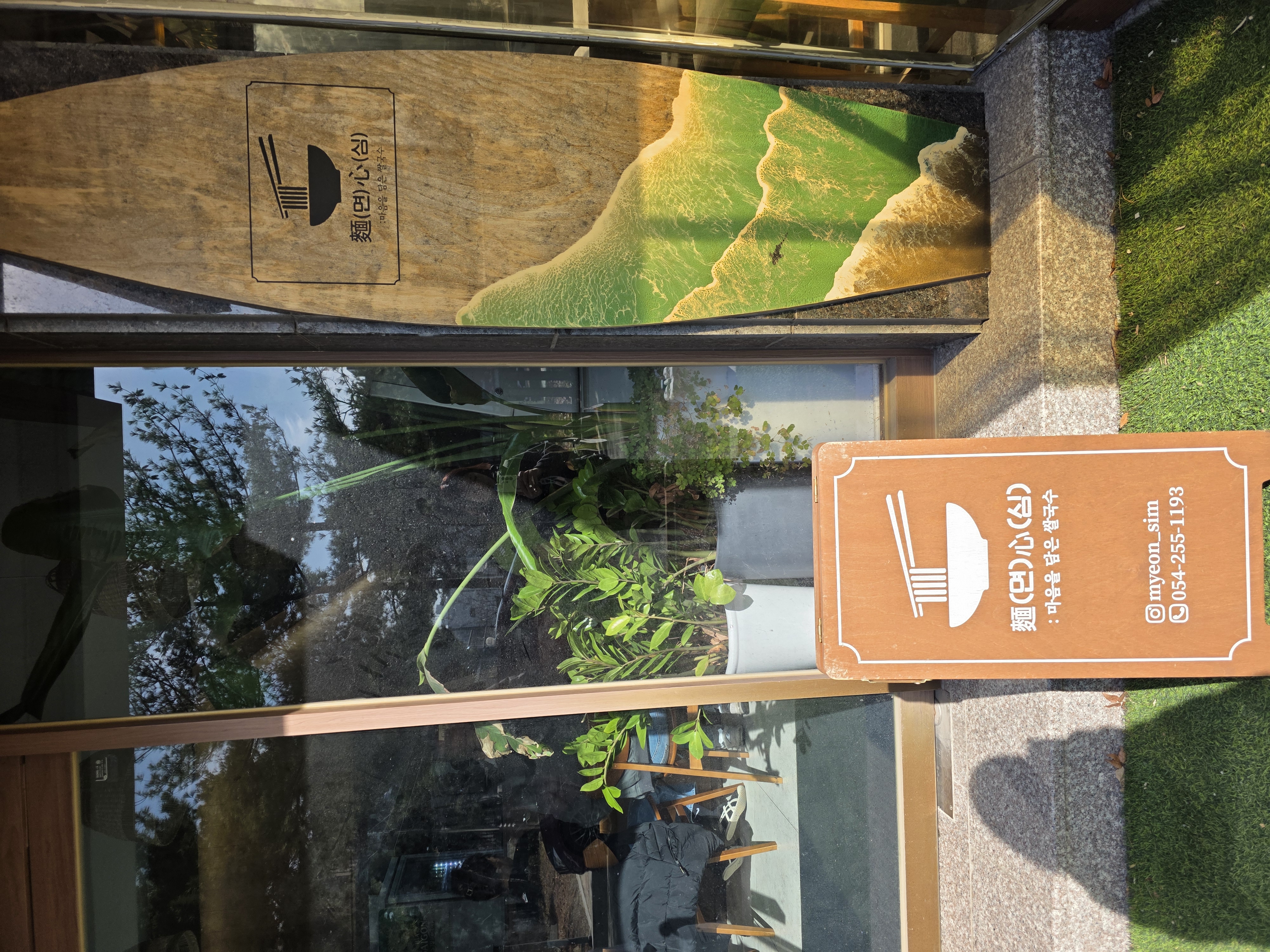 가게 입구의 작은 잔디밭과 서핑보드 장식, 그리고 센스있는 한자 간판이 이국적인 분위기를 더해주었어요.